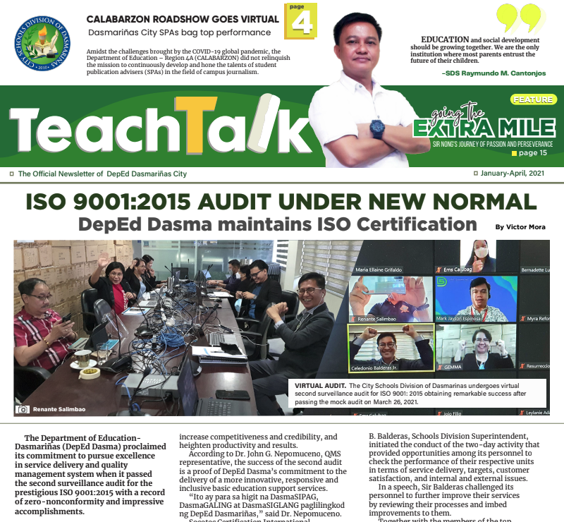 TEACHTALK: The Official Online Publication of the City Schools Division Office (CSDO) Dasmarinas, The Special Edition, Calendar Year 2021 Do you have worthy educational articles in your school or community to share? Bring out and awaken the writer within yourself. Come and be part of TeachTalk, the official newsletter of the DepEd Dasmariñas. Please send continue reading : TEACHTALK The Special Edition, Calendar Year 2021